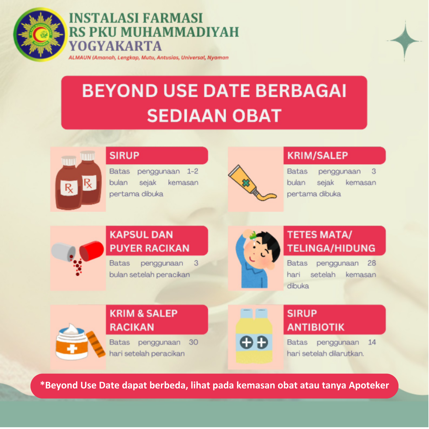 Sebagai konsumen cerdas, kita harus lebih teliti dalam menggunakan obat. Jangan lupa untuk selalu memeriksa tanggal kadaluarsa obat, beyond use date obat dan kondisi fisiknya sebelum digunakan. Langkah sederhana ini dapat mencegah risiko penggunaan obat yang tidak tepat bahkan berbahaya.
